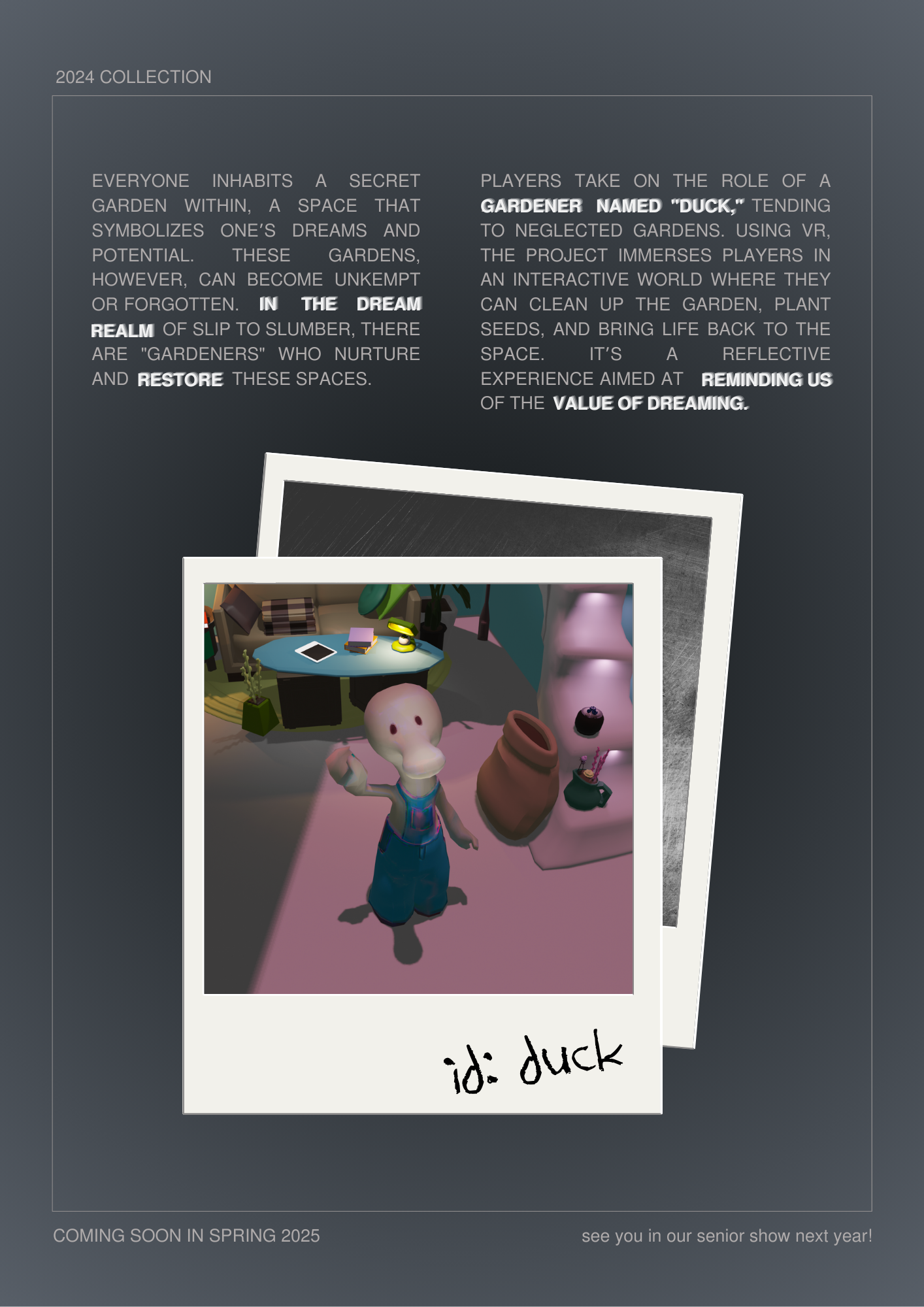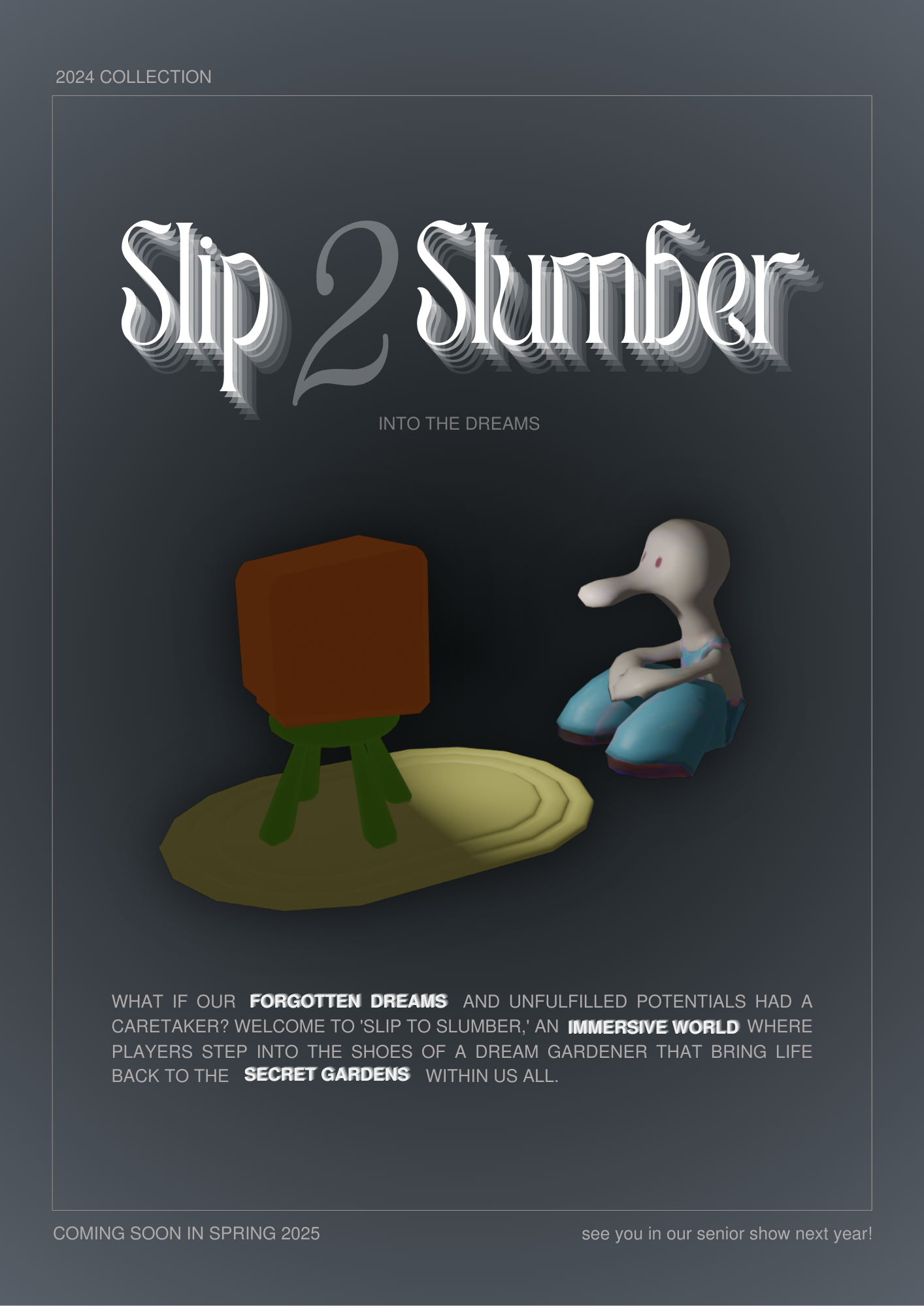 The last iteration of Slip to Slumber invites you to explore the secret gardens we each nurture within. These inner landscapes are shaped by our untapped potential and our dreams that are left forgotten. As a visitor you breathe life back into space simply by noticing what has been overlooked and capturing those moments with a virtual Polaroid camera. This reflective experience aims to remind us of the value of dreaming.