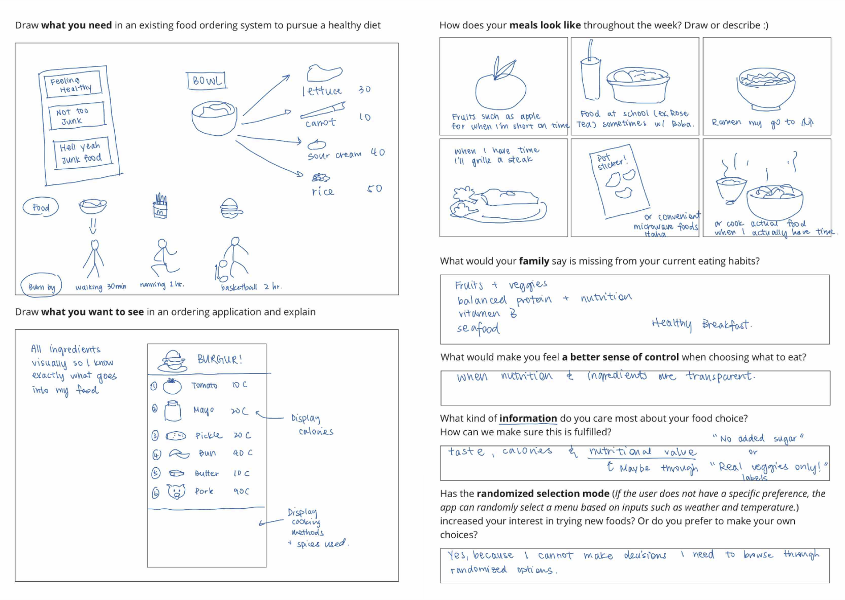 Initial interviews confirmed that while users want healthy diets, they are constrained by the limited time and willingness to personally manage their complex eating habits. Further generative research identified the critical need for a personalized system providing known ingredient details and better control, validating the core solution pillars of Personalization, Transparency, and Supervision.