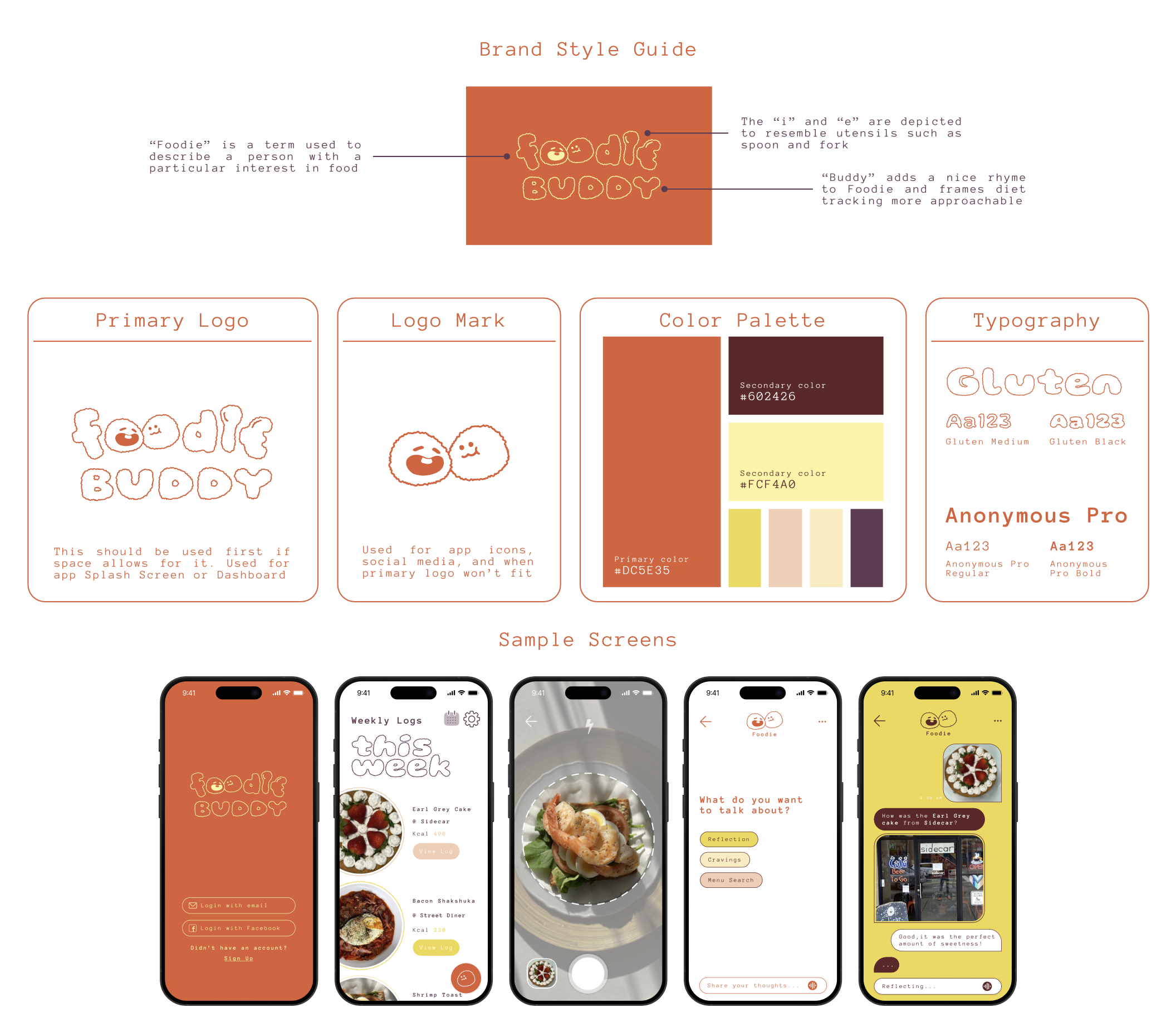 After the project finished, I personally further developed the branding for “Foodie Buddy” because I felt a missing connection between making this application more approachable for our target users.